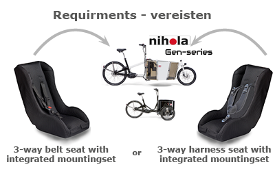 Depending on the type of safety belt used in your cargo bike, the correct mounting set will be supplied. This mounting set is brand-and belt specific.