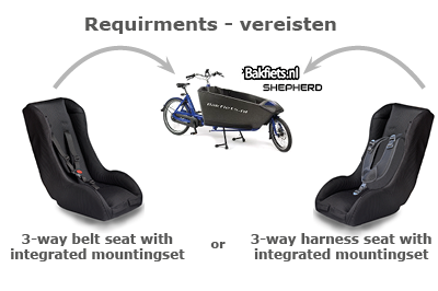 • BAKFIETS: 3 punts BAKFIETS.NL SHEPHERD bevestigingsset (uitsluitend icm een stoel met geïntegreerde bevestiging)